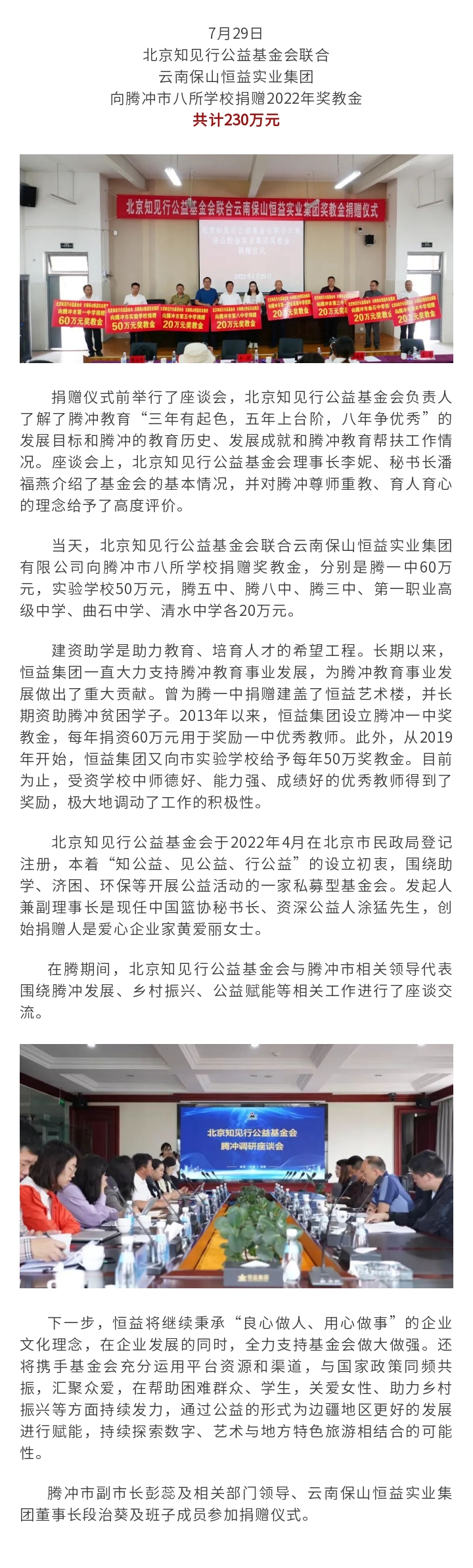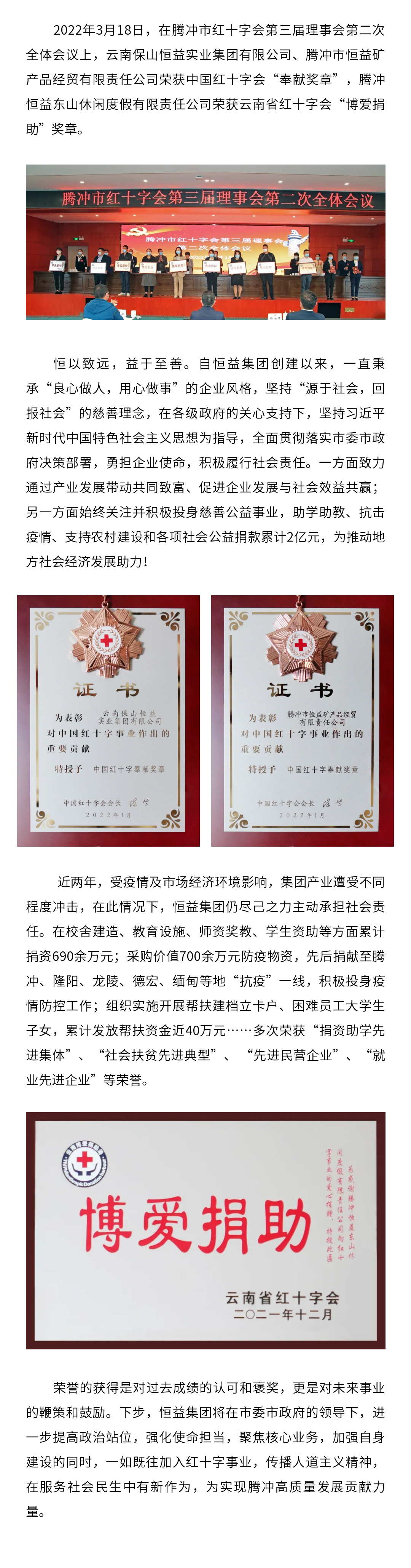 2018年6月1日,為增進社區發展,提升社區公共場所相關配套設施,恒益集團向騰越鎮玉璧社區芹菜塘自然村捐贈4萬元;