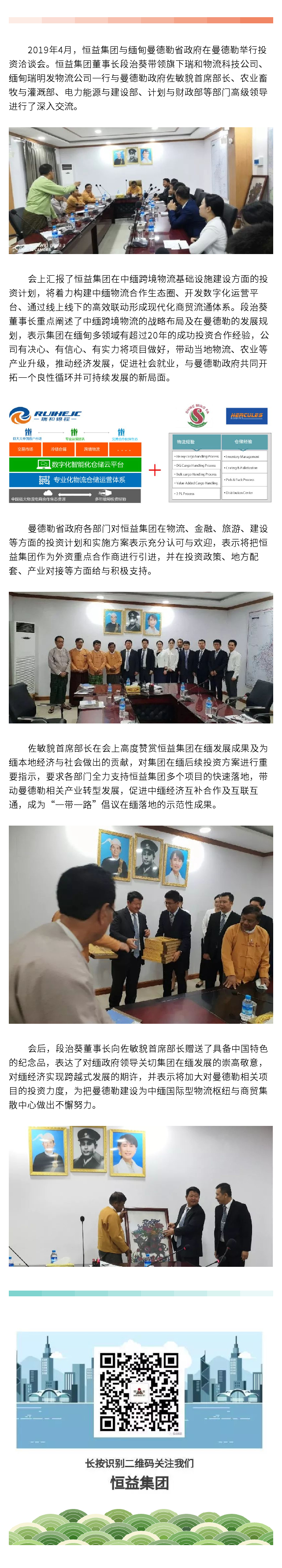 恒益集團董事長段治葵一行與緬甸曼德勒省政府舉行投資洽談 來源: 瀏覽量:9144 日期:2019-05-09 分享到: 上一篇:恒益集團組織召開戰略部署及強化內部管理會議 下一篇:京東集團到訪恒益,達成農牧業領域合作共識