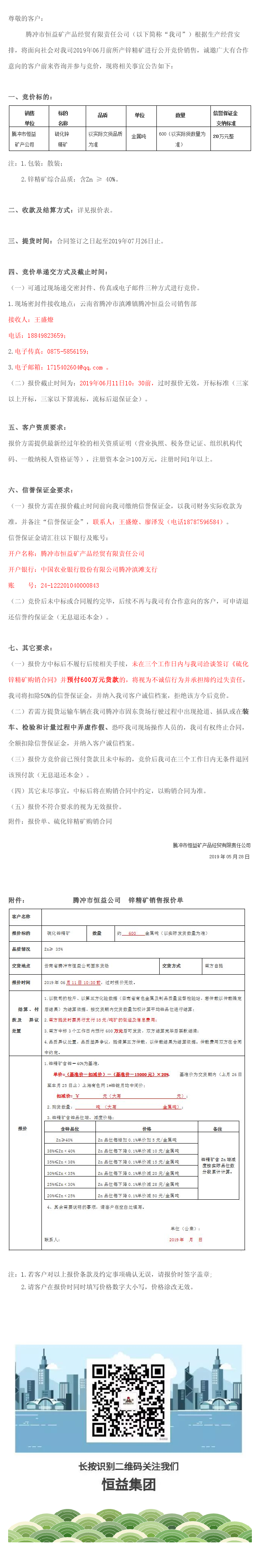 騰沖市恒益礦產品經貿公司關于鋅精礦競價銷售公告(201904)號 來源: 瀏覽量:9129 日期:2019-05-28 分享到: 上一篇:高黎貢國際健康旅居小鎮低層住宅八組團-江山小院精裝樣板房裝修施工工程招標公告 下一篇:騰沖市恒益礦產品經貿公司關于鋅精礦競價銷售公告(201903)號