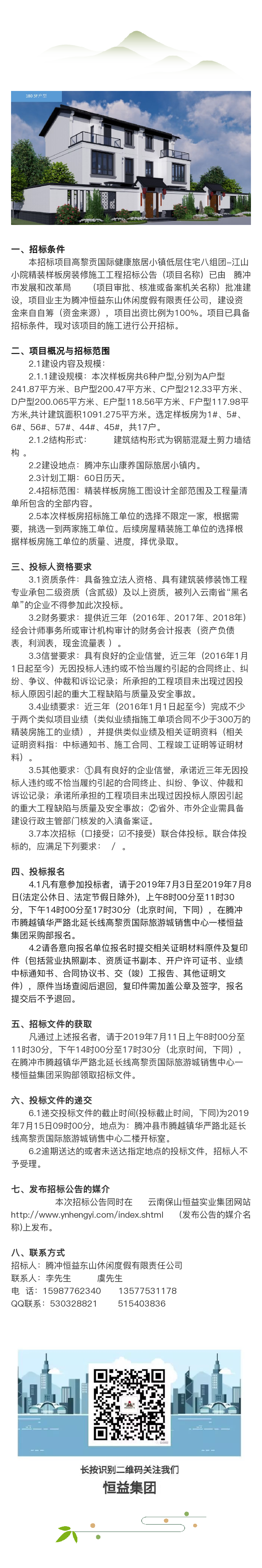 高黎貢國際健康旅居小鎮(zhèn)低層住宅八組團(tuán)-江山小院精裝樣板房裝修施工工程招標(biāo)公告 來源: 瀏覽量:10100 日期:2019-07-04 分享到: 上一篇:高黎貢國際健康旅居小鎮(zhèn)低層住宅八組團(tuán)—江山小院門頭及圍墻工程招標(biāo)公告 下一篇:騰沖市恒益礦產(chǎn)品經(jīng)貿(mào)公司關(guān)于鋅精礦競價銷售公告(201904)號