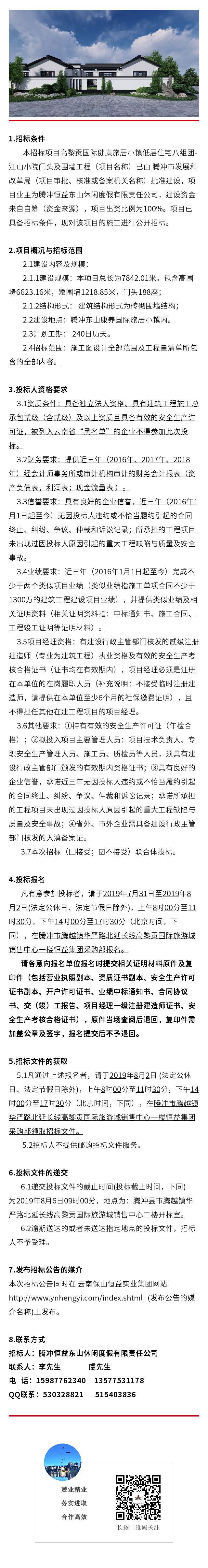 高黎貢國際健康旅居小鎮(zhèn)低層住宅八組團—江山小院門頭及圍墻工程招標公告 來源: 瀏覽量:9852 日期:2019-08-01 分享到: 上一篇:騰沖市恒益礦產(chǎn)品經(jīng)貿(mào)有限責任公司關(guān)于鋅精礦競價銷售公告(201905)號 下一篇:高黎貢國際健康旅居小鎮(zhèn)低層住宅八組團-江山小院精裝樣板房裝修施工工程招標公告