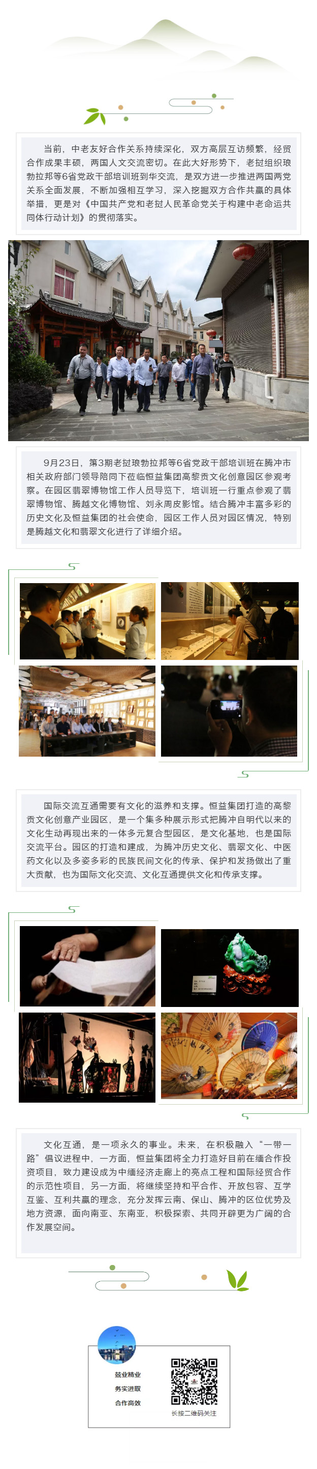 第3期老撾瑯勃拉邦等6省黨政干部培訓班蒞臨高黎貢文化創意園區參觀考察 來源: 瀏覽量:7954 日期:2019-09-24 分享到: 上一篇:騰沖市副市長李屏一行蒞臨恒益健康體檢中心調研指導 下一篇:商務部紀檢監察穩外貿調研組蒞臨恒益集團調研