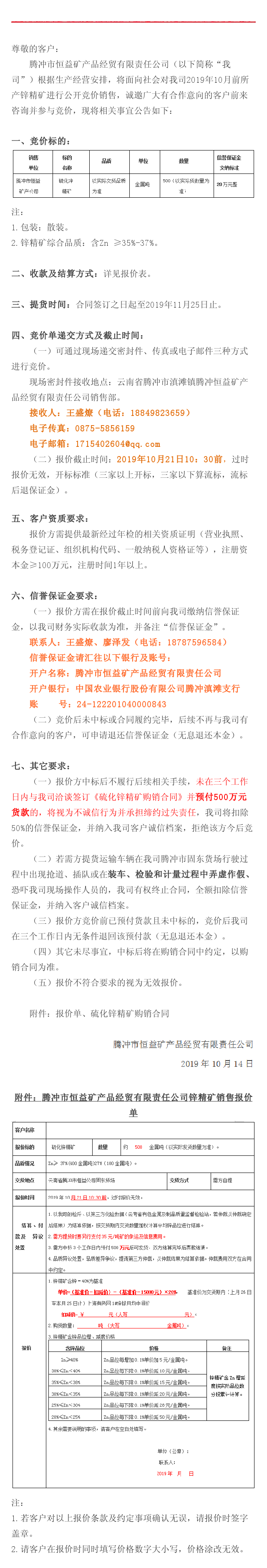 騰沖市恒益礦產品經貿有限責任公司關于鋅精礦競價銷售公告(201905)號 來源: 瀏覽量:9441 日期:2019-10-14 分享到: 上一篇:騰沖市恒益礦產品經貿有限責任公司關于鋅精礦競價銷售公告(201910)號 下一篇:騰沖市恒益礦產品經貿有限責任公司關于鋅精礦競價銷售公告(201905)號