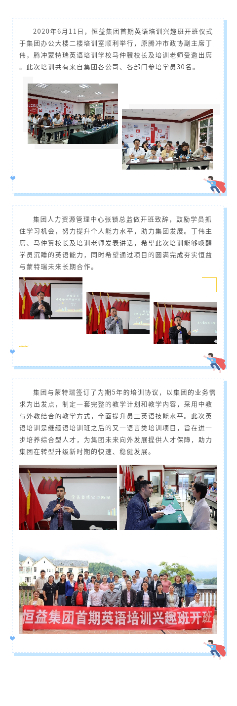 恒益集團(tuán)首期英語(yǔ)培訓(xùn)興趣班順利開(kāi)班 來(lái)源: 瀏覽量:7280 日期:2020-06-12 分享到: 上一篇:恒益集團(tuán)2020年半年度經(jīng)濟(jì)運(yùn)行分析會(huì)隆重召開(kāi) 下一篇:騰沖市恒益礦產(chǎn)品經(jīng)貿(mào)有限責(zé)任公司哨坡選廠脫水干堆、廢水循環(huán)利用技術(shù)改造項(xiàng)目 環(huán)境影響報(bào)告書(shū) 公眾參與第一次信息公示