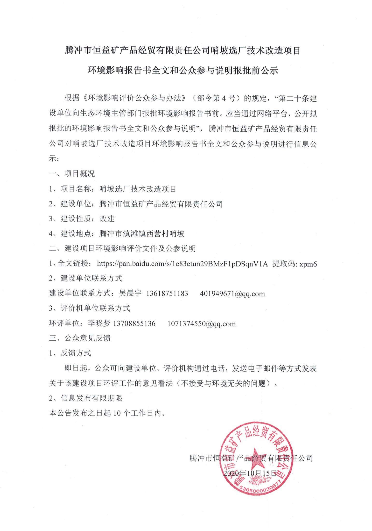 騰沖市恒益礦產品經貿有限責任公司哨坡選廠技術改造項目環境影響報告書全文和公眾參與說明報批前公示 來源: 瀏覽量:7700 日期:2020-10-16 分享到: 上一篇:恒益集團組織召開人才盤點大會 下一篇:恒益集團組織召開2021年全面預算編制工作啟動及培訓會
