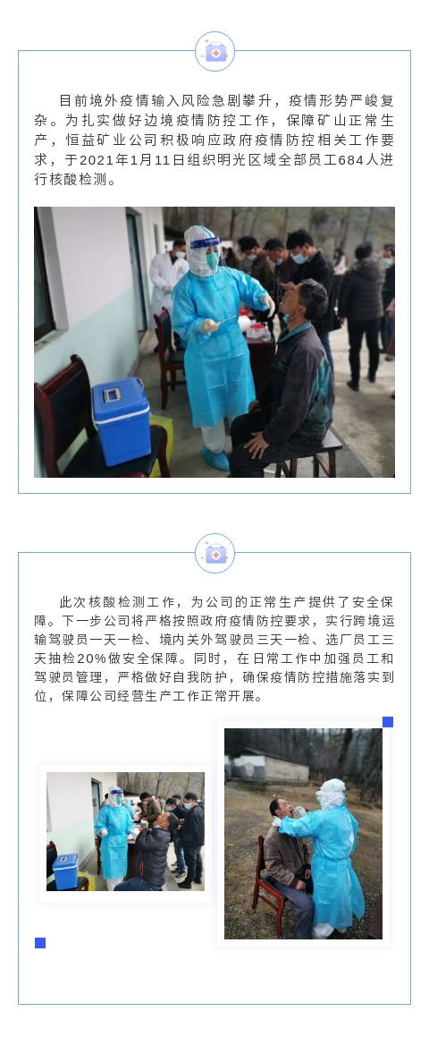 恒益礦業(yè)公司明光區(qū)域組織全員進行核酸檢測 來源: 瀏覽量:6855 日期:2021-01-13 分享到: 上一篇:國內(nèi)第一本系統(tǒng)介紹翡翠文化形成與發(fā)展歷程的圖書——《翡翠簡史》在云南騰沖正式發(fā)行 下一篇:恒益集團優(yōu)秀青年茶話會順利組織