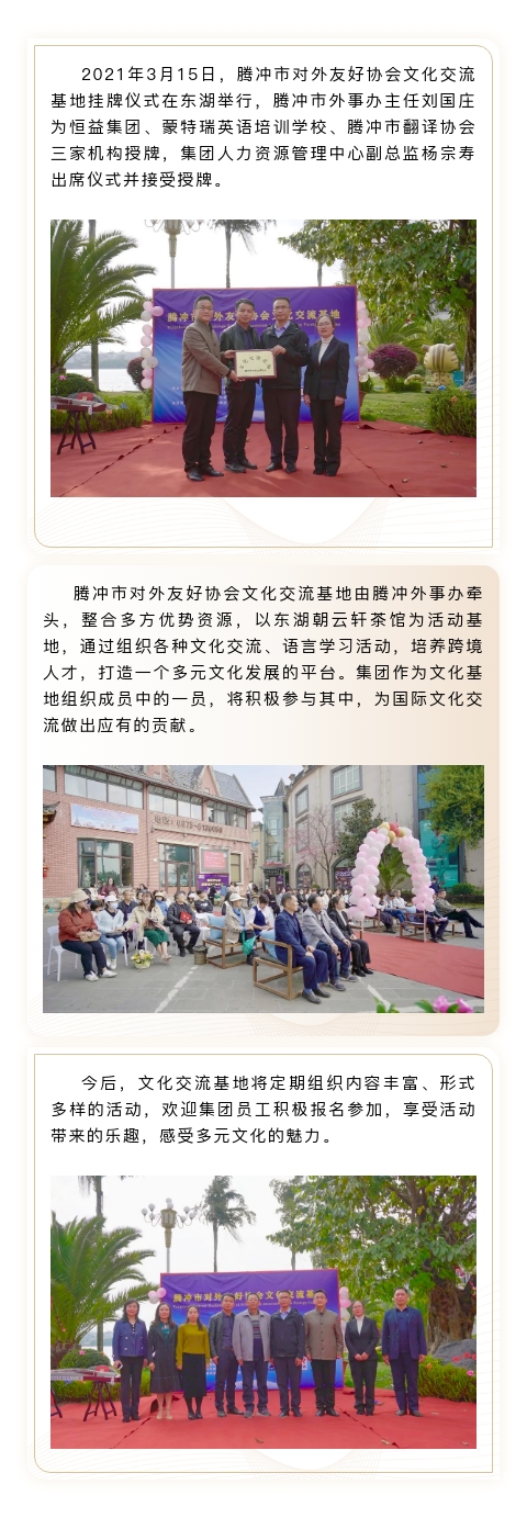 恒益集團掛牌“騰沖市對外友好協(xié)會文化交流基地” 來源: 瀏覽量:6648 日期:2021-03-16 分享到: 上一篇:爛刺溝尾礦庫驗收公示內(nèi)容 下一篇:“東山之下,原創(chuàng)詩歌、散文分享會”在東山書院隆重舉行