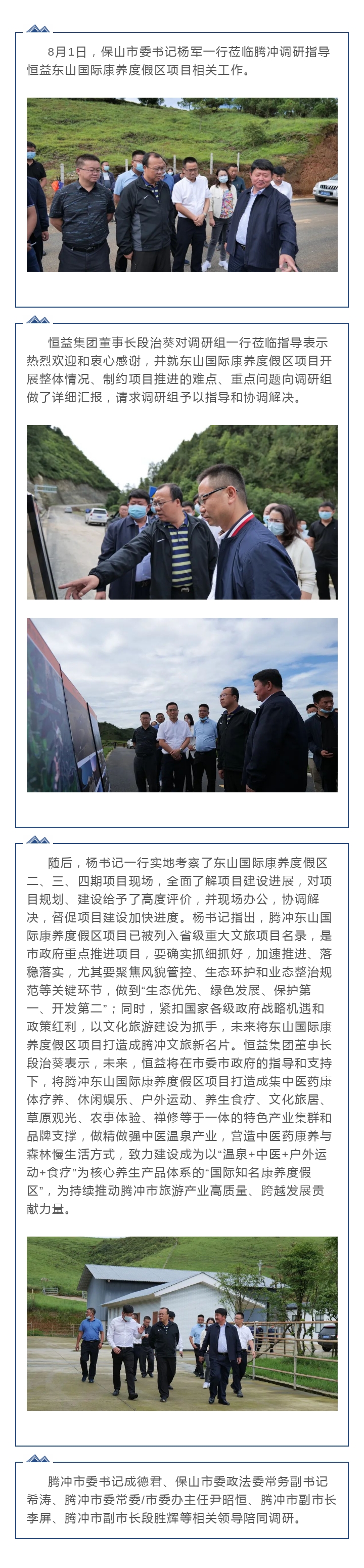 保山市委書記楊軍一行蒞臨東山國際康養(yǎng)度假區(qū)調研指導 來源: 瀏覽量:6514 日期:2021-08-03 分享到: 上一篇:守望相助,毗鄰同好——恒益集團向緬捐贈價值人民幣218萬元抗疫物資 下一篇:恒益集團第二屆董事會第三次會議暨2021年半年度經濟運行分析會圓滿舉行