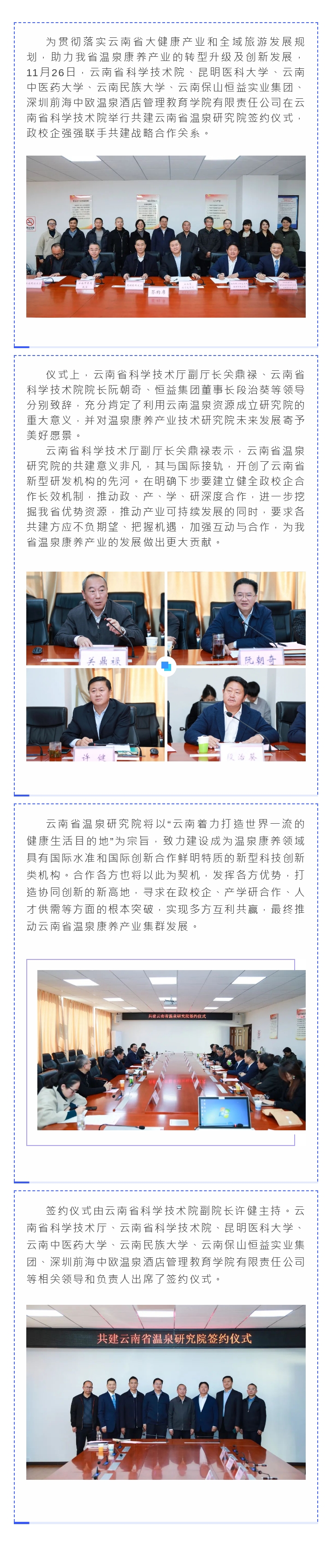 政校企共建云南省溫泉研究院簽約儀式成功舉辦 來源: 瀏覽量:5970 日期:2021-12-01 分享到: 上一篇:保山市科技局局長李晞一行蒞臨恒益農業調研指導 下一篇:恒益康旅“溫泉療法體驗營”活動順利結營