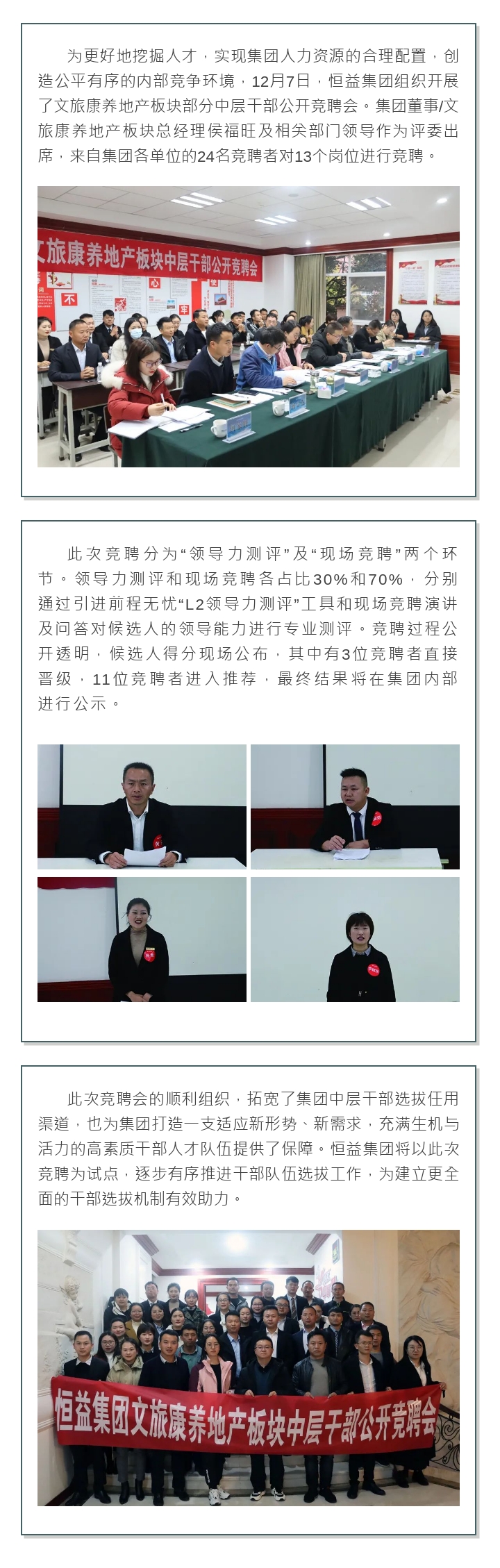 恒益集團文旅康養地產板塊部分中層干部公開競聘會議順利召開 來源: 瀏覽量:6257 日期:2021-12-08 分享到: 上一篇:恒益集團第二屆董事會第四次會議舉行 下一篇:恒益集團景秀東山項目品鑒會成功舉辦