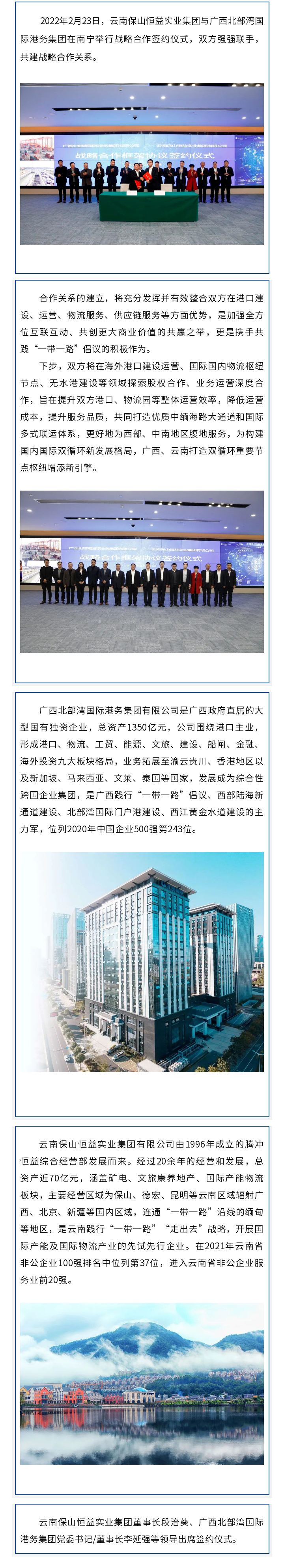 云南保山恒益實業集團與廣西北部灣國際港務集團簽訂戰略合作協議 來源: 瀏覽量:5879 日期:2022-02-24 分享到: 上一篇:校企合作,共推溫泉康養產業發展 下一篇:恒益集團第二屆董事會第四次會議舉行