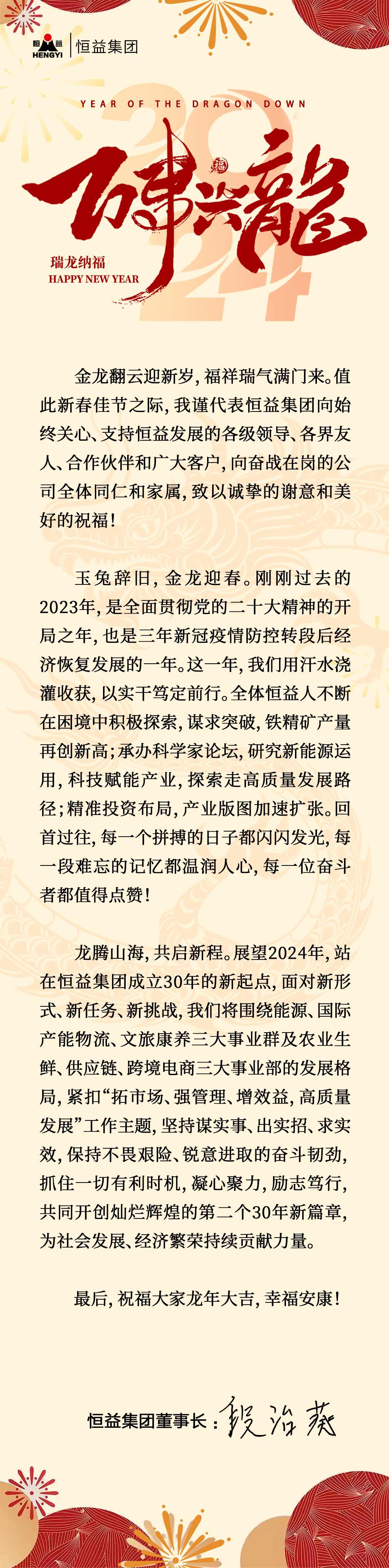 恒益集團2024年新春賀詞 來源: 瀏覽量:4154 日期:2024-02-09 分享到: 上一篇:龍騰盛世,共舞新春丨恒益集團受邀參加緬甸華僑界龍年新春慶典 下一篇:強強聯合集聚發展效能 合作共贏助力產業騰飛