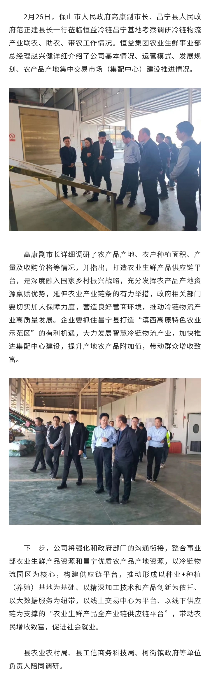 加快打造農業生鮮產品供應鏈平臺 帶動群眾增收致富 來源: 瀏覽量:3974 日期:2024-02-27 分享到: 上一篇:馬子興到恒益集團召開騰沖市服務企業推進項目建設座談會 下一篇:龍騰盛世,共舞新春丨恒益集團受邀參加緬甸華僑界龍年新春慶典