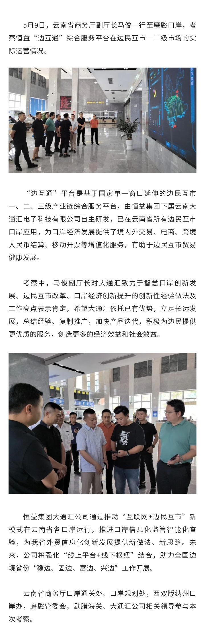 云南省商務廳副廳長一行赴磨憨考察恒益“邊互通”綜合服務平臺實際運營 來源: 瀏覽量:3838 日期:2024-05-11 分享到: 上一篇:“知見行杯·奔跑吧少年”2024年騰沖市第七屆小學生校園籃球聯(lián)賽圓滿落幕 下一篇:五一假期咋個耍?東山草原活動來襲