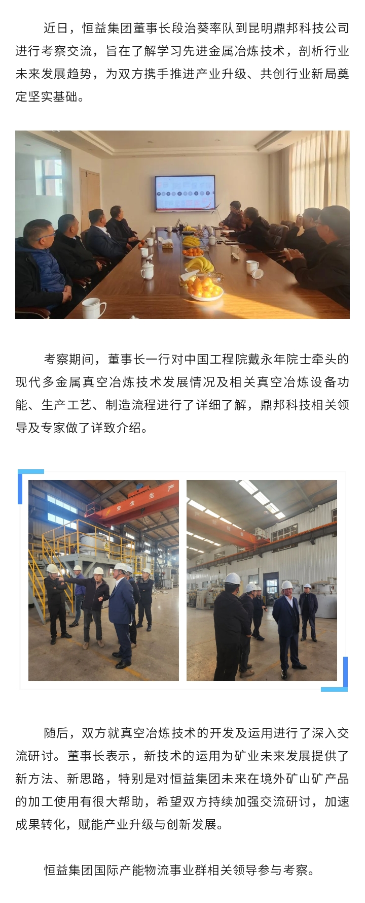 恒益集團(tuán)董事長(zhǎng)段治葵率隊(duì)到昆明鼎邦科技公司考察交流 來(lái)源: 瀏覽量:3681 日期:2025-01-23 分享到: 上一篇:恒益集團(tuán)召開(kāi)2025年產(chǎn)業(yè)創(chuàng)新目標(biāo)及任務(wù)分解工作指導(dǎo)會(huì) 下一篇:拓市場(chǎng),強(qiáng)管理,增效益,高質(zhì)量發(fā)展——恒益集團(tuán)組織召開(kāi)第三屆董事會(huì)第二次會(huì)議暨2024年度工作會(huì)議