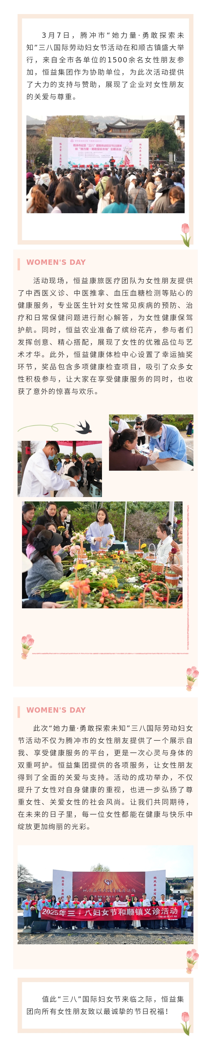 巾幗綻芳華,健康共守護丨恒益集團積極協助騰沖市 “三八”國際婦女節活動圓滿舉行 來源: 瀏覽量:3015 日期:2025-03-07 分享到: 上一篇:政企攜手繪藍圖 林下經濟助振興 下一篇:騰沖海關機關黨委、騰沖機場黨委及騰沖恒益東山黨支部聯誼主題黨日活動圓滿舉行