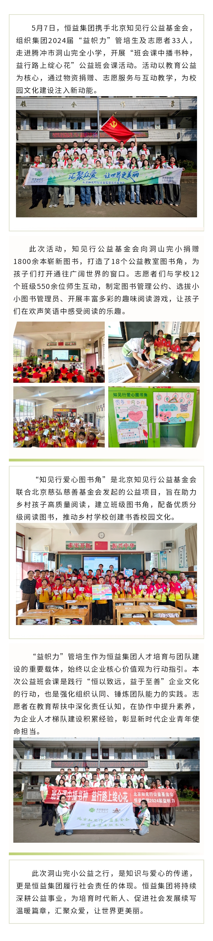 恒益集團攜手知見行公益基金會,助力鄉村學子“悅”讀未來 來源: 瀏覽量:2095 日期:2025-05-08 分享到: 上一篇:騰沖東山草原定制公交開通,暢玩草原更輕松 下一篇:五一 ▏恒益第六屆玫瑰采摘節,與花海抱個滿懷!
