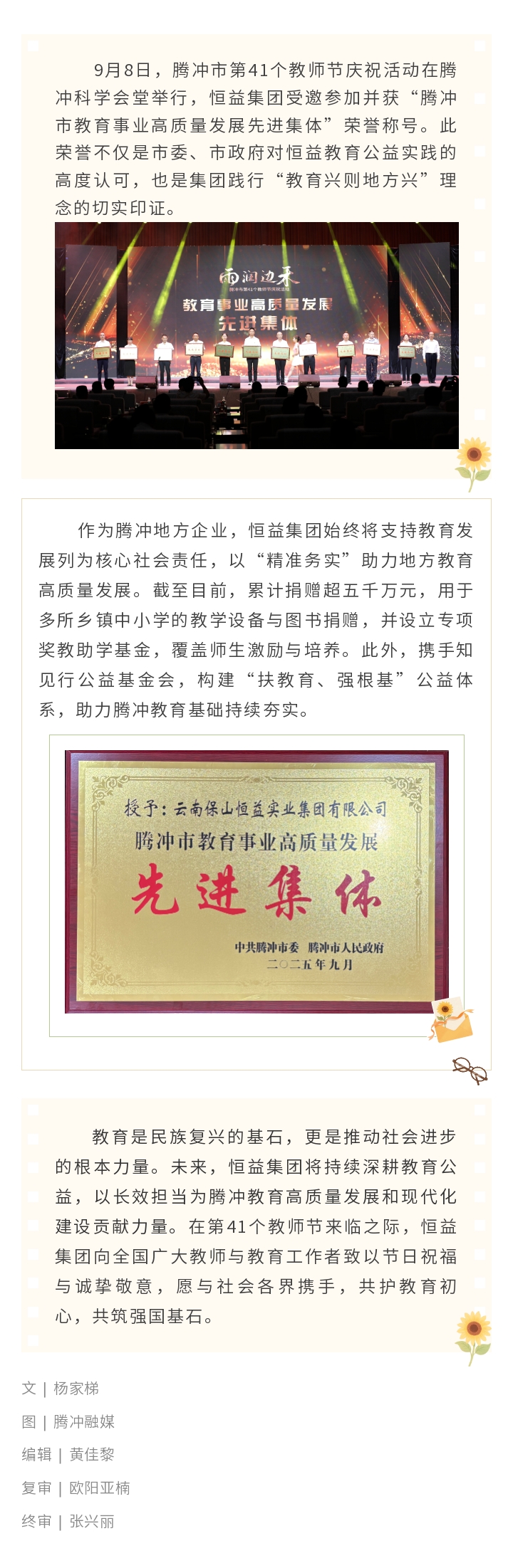 喜訊丨恒益集團榮膺2025年“騰沖市教育事業高質量發展先進集體”稱號 來源: 瀏覽量:1064 日期:2025-09-08 分享到: 上一篇:恒益集團與省心說科技達成合作 共筑微信電商新生態 下一篇:恒益集團濱鯤中智與猴橋鎮簽約 共筑高原高端淡水魚養殖基地