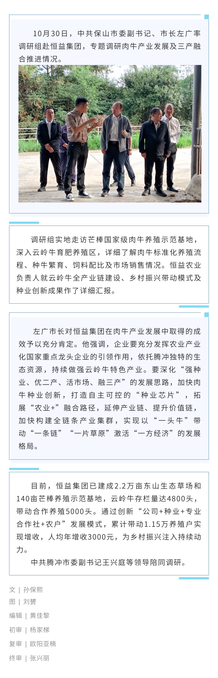 保山市市長率隊(duì)調(diào)研恒益集團(tuán)云嶺牛產(chǎn)業(yè)發(fā)展情況 來源: 瀏覽量:300 日期:2025-10-31 分享到: 上一篇:恒益溫泉醫(yī)康養(yǎng)(儀征)項(xiàng)目正式啟動(dòng) 致力打造長三角溫泉醫(yī)康養(yǎng)產(chǎn)業(yè)新標(biāo)桿 下一篇:共筑康養(yǎng)新未來 | 恒益集團(tuán)與古兜控股強(qiáng)強(qiáng)聯(lián)手,簽署戰(zhàn)略合作協(xié)議