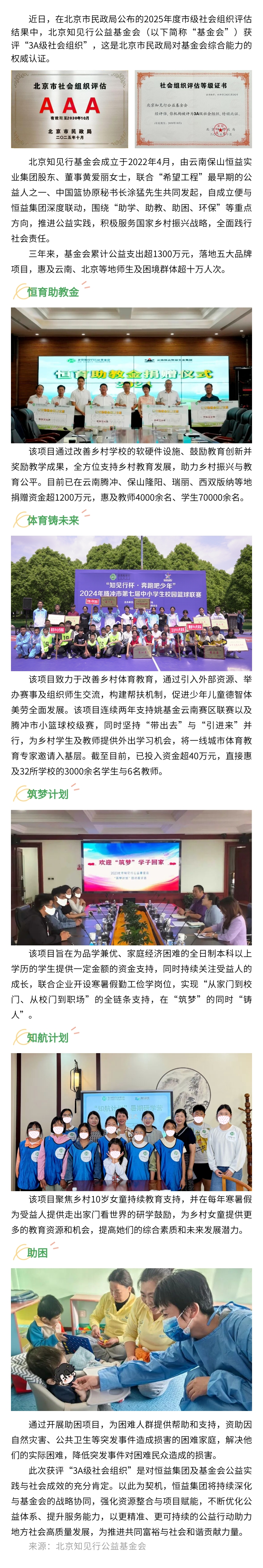 北京知見行公益基金會獲評“3A級社會組織” 來源: 瀏覽量:50 日期:2025-11-13 分享到: 上一篇:東西方慈善論壇聯合創始人一行到訪恒益集團 共探公益合作新路徑 下一篇:恒益溫泉醫康養(儀征)項目正式啟動 致力打造長三角溫泉醫康養產業新標桿